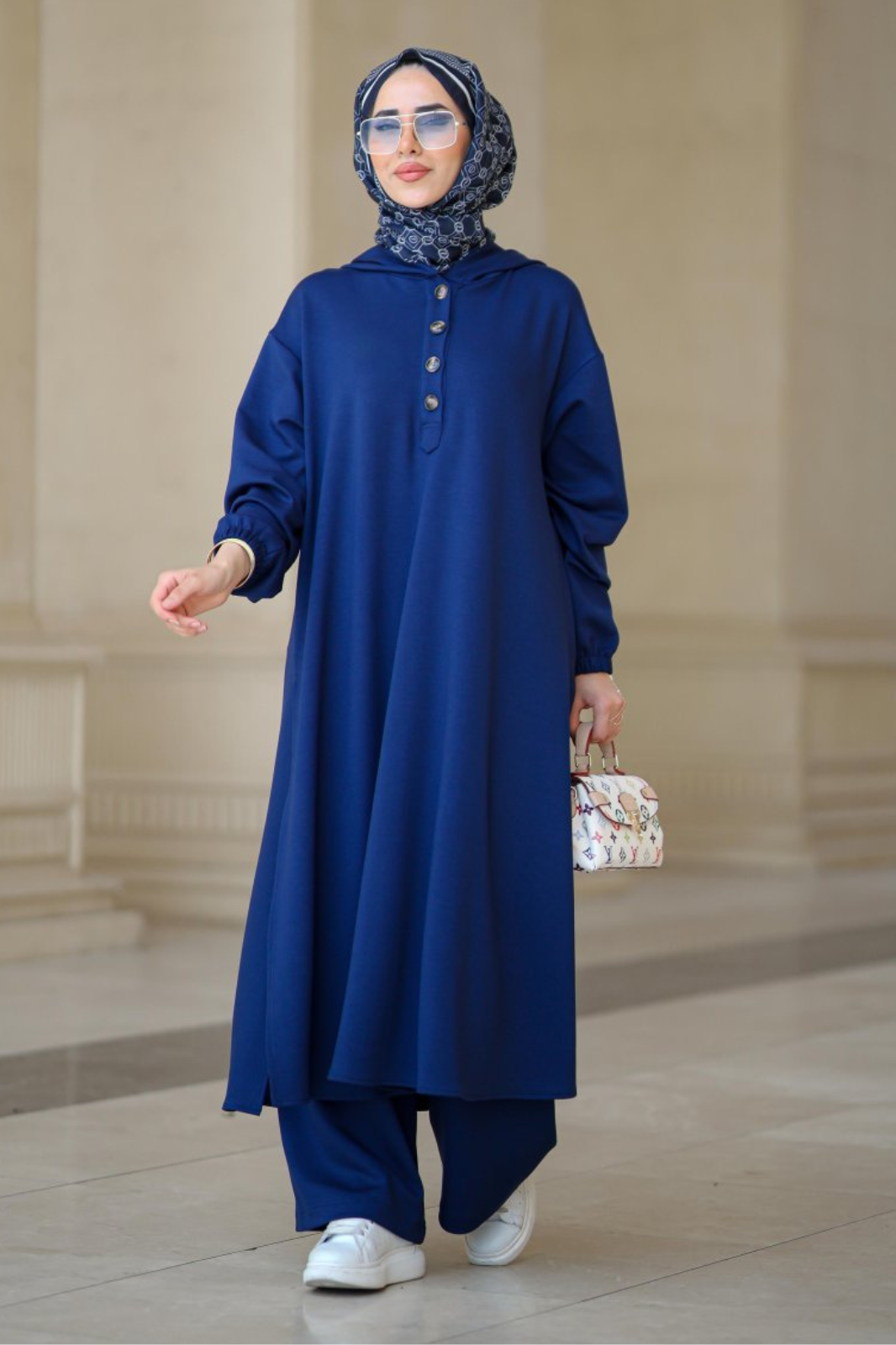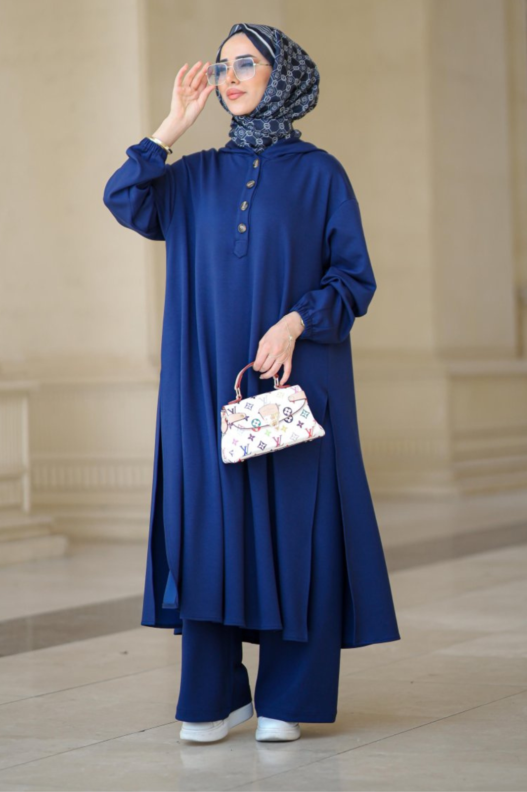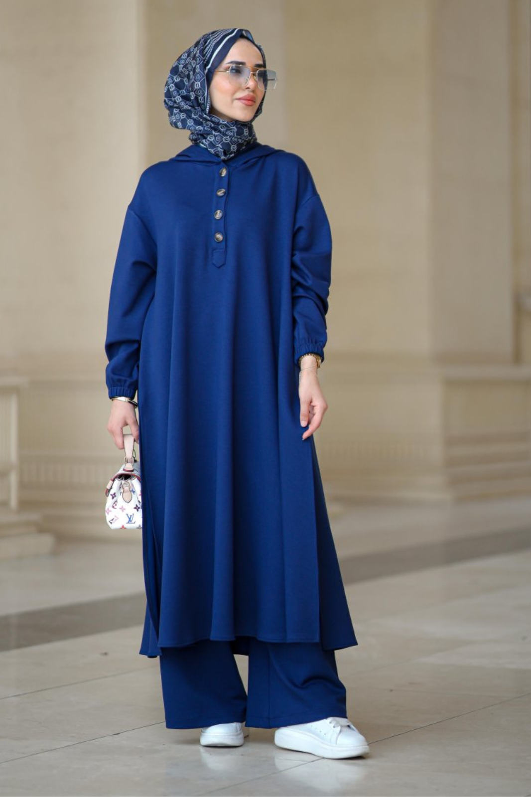 A chic two-piece modest set designed for effortless elegance. The outfit features a loose-fitting tunic with a hood, button detail on the front, and comfortable elastic sleeves, paired with wide-leg pants for a flowy silhouette. Made from soft, wrinkle-resistant fabric, it’s perfect for daily wear, travel, or casual outings while keeping comfort and style in balance.