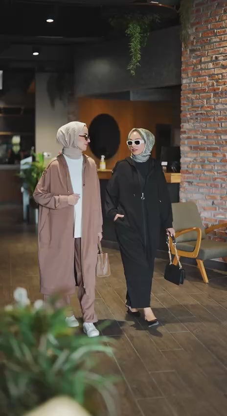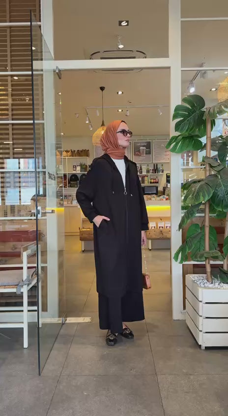 This elegant two-piece set combines effortless comfort with modest sophistication. The outfit features a long, zip-front tunic with a relaxed, oversized fit, front pockets, and subtle shoulder detailing. Paired with wide-leg pants, it offers a clean, modern silhouette perfect for travel, casual outings, or daily wear.