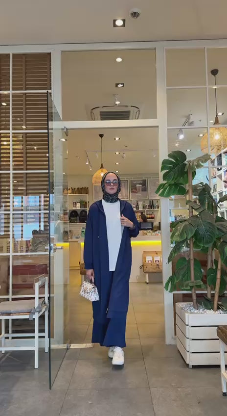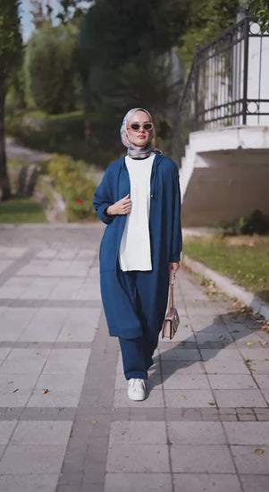 This elegant two-piece set combines effortless comfort with modest sophistication. The outfit features a long, zip-front tunic with a relaxed, oversized fit, front pockets, and subtle shoulder detailing. Paired with wide-leg pants, it offers a clean, modern silhouette perfect for travel, casual outings, or daily wear.