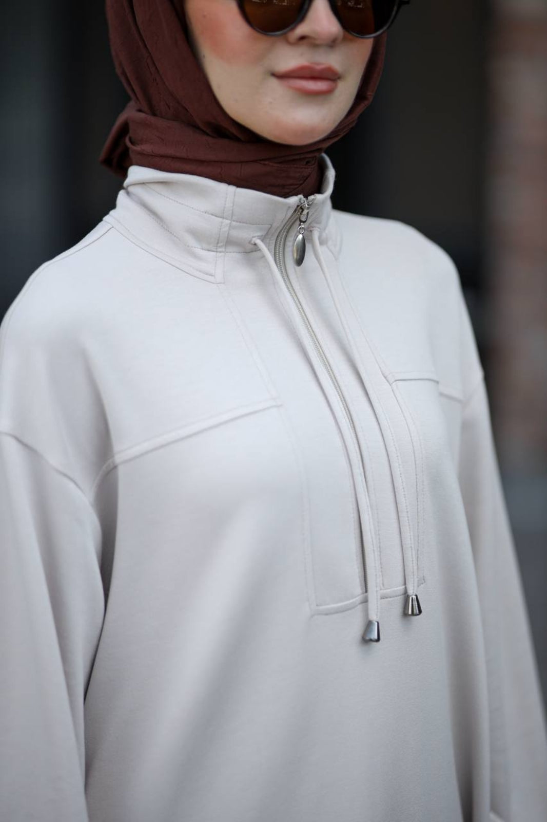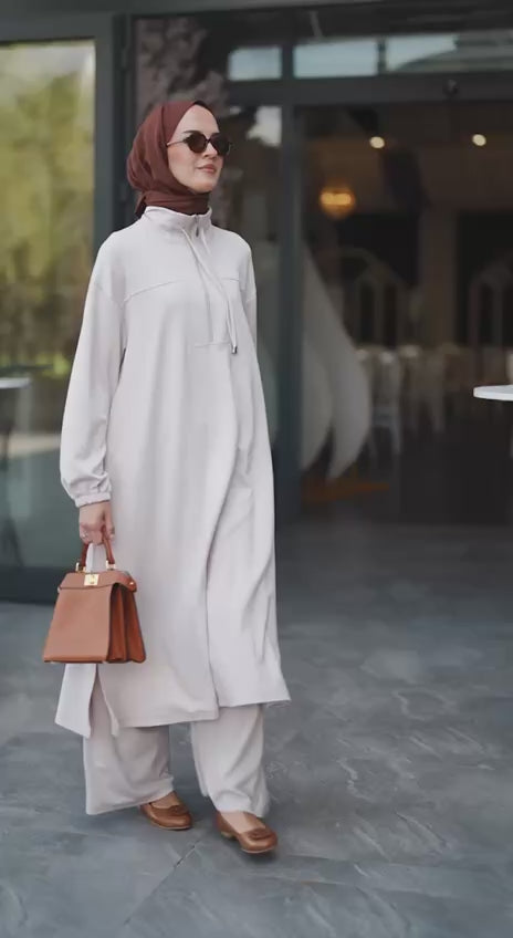A chic and effortless two-piece set designed for everyday elegance in cooler weather. The relaxed long tunic features a high neckline with drawstring detail and matching wide-leg pants that create a modest, modern silhouette. Crafted from soft, breathable fabric with a cozy feel, it moves beautifully while keeping you polished from day to night — perfect for outings, travel, or casual gatherings.