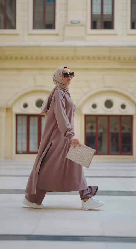 A chic two-piece modest set designed for effortless elegance. The outfit features a loose-fitting tunic with a hood, button detail on the front, and comfortable elastic sleeves, paired with wide-leg pants for a flowy silhouette. Made from soft, wrinkle-resistant fabric, it’s perfect for daily wear, travel, or casual outings while keeping comfort and style in balance.
