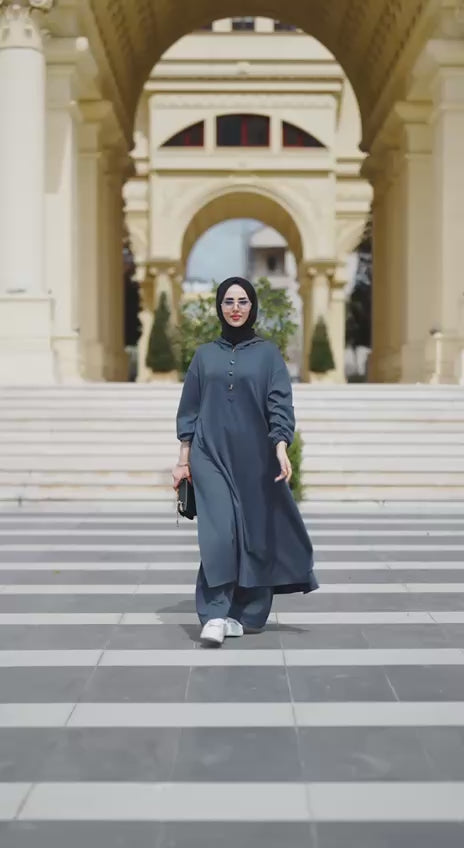A chic two-piece modest set designed for effortless elegance. The outfit features a loose-fitting tunic with a hood, button detail on the front, and comfortable elastic sleeves, paired with wide-leg pants for a flowy silhouette. Made from soft, wrinkle-resistant fabric, it’s perfect for daily wear, travel, or casual outings while keeping comfort and style in balance.