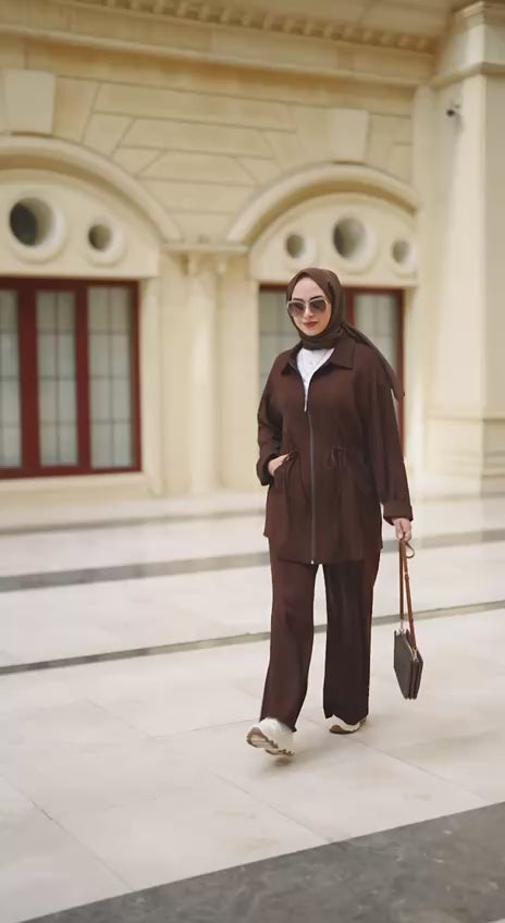 This two-piece modest set brings that clean, effortless look everyone keeps trying to copy. The top features a front zipper and an adjustable drawstring waist for a flattering, easy fit, plus practical side pockets. Wide-leg pants give relaxed movement and all-day comfort. Made from a soft, smooth fabric that drapes beautifully, it's the ideal outfit for daily outings, travel, or a polished casual style without the effort.
