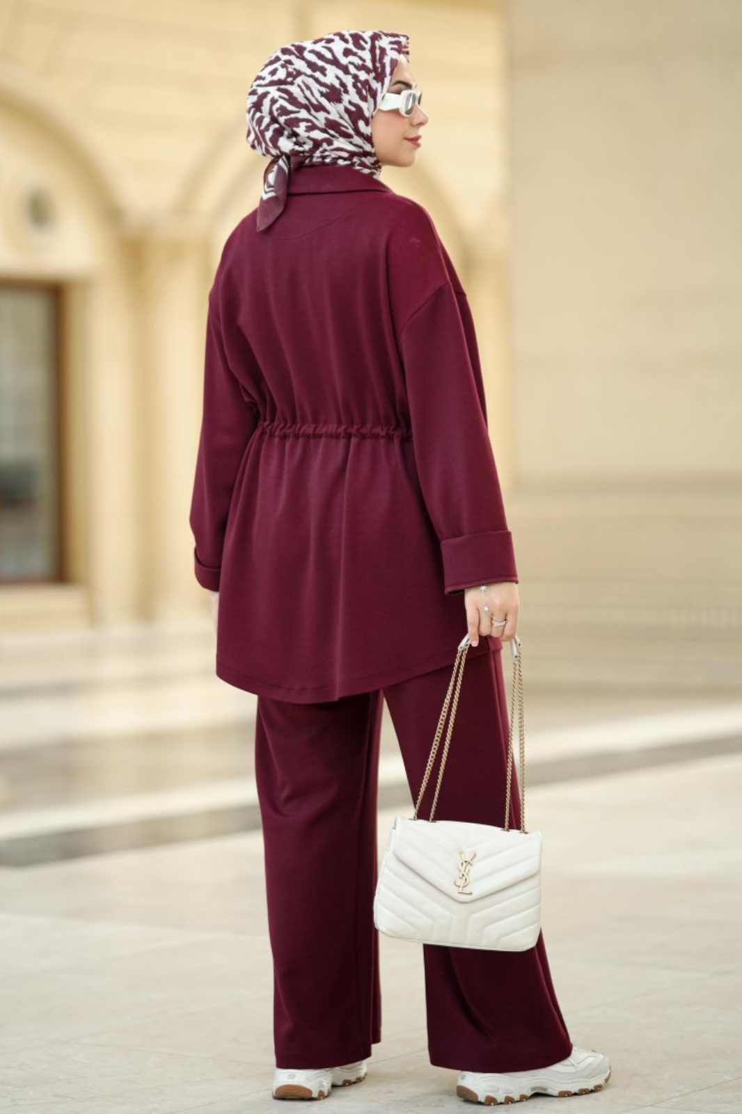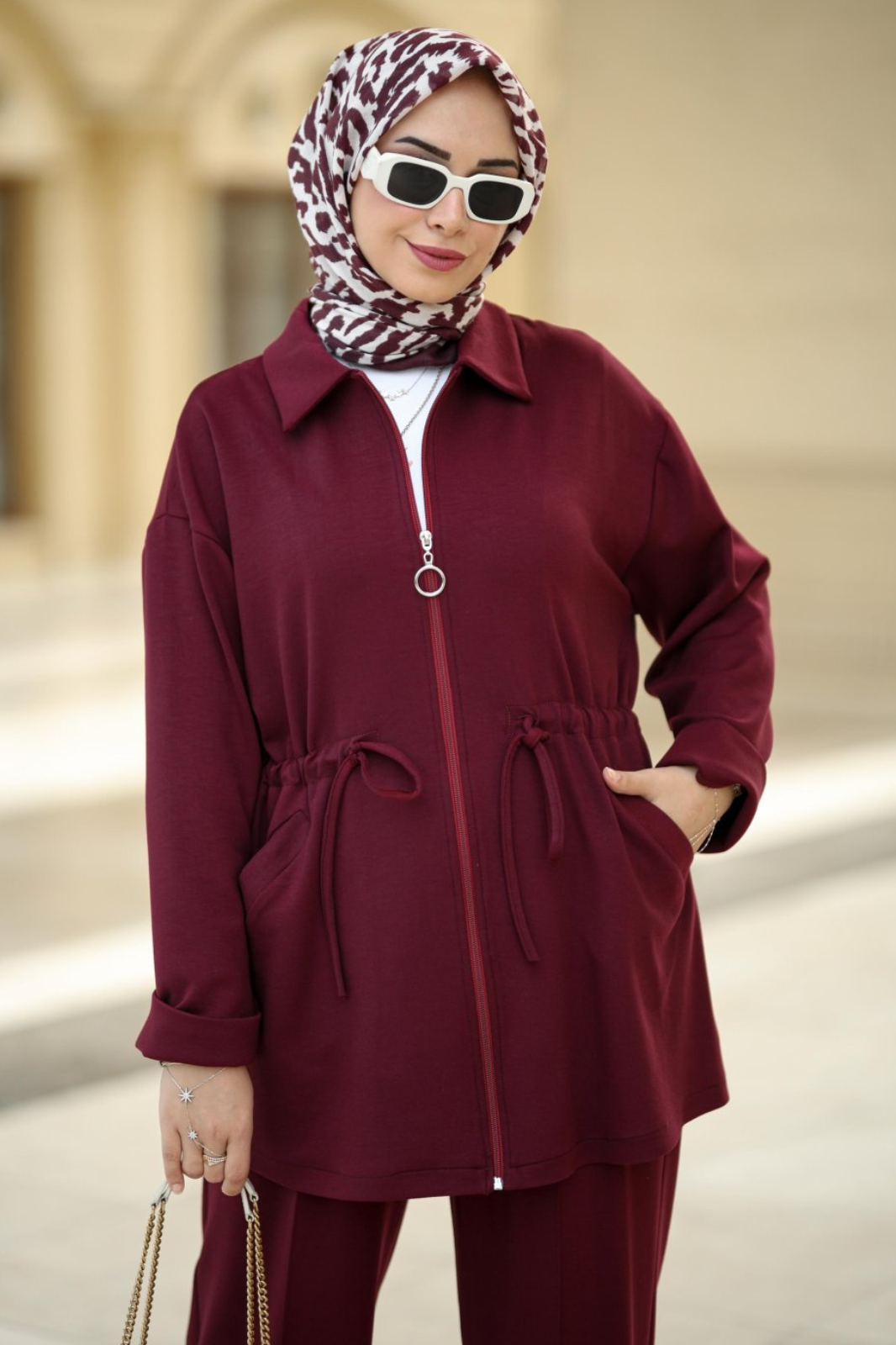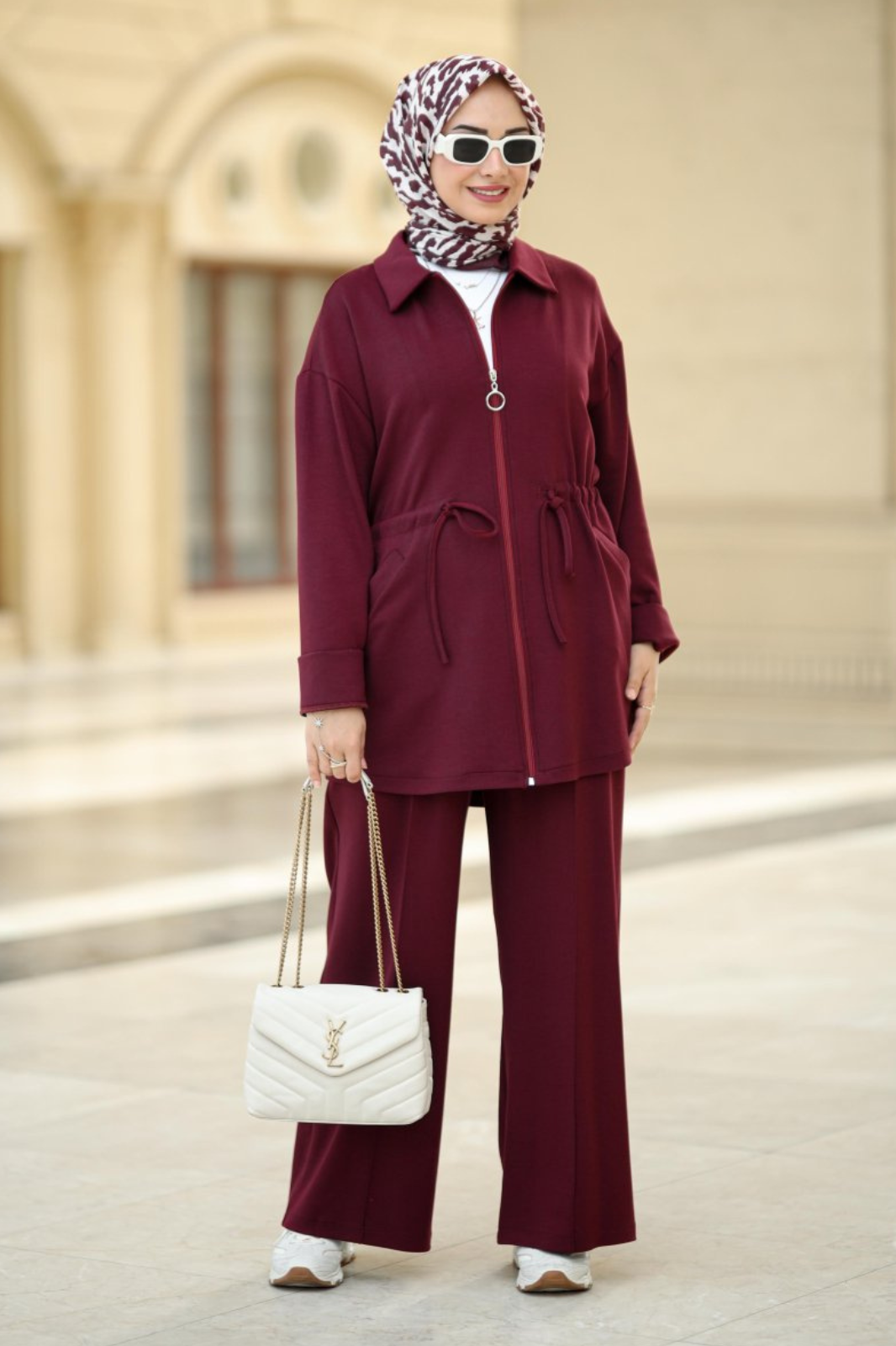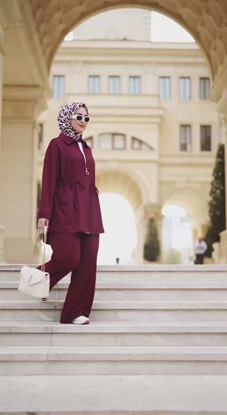 This two-piece modest set brings that clean, effortless look everyone keeps trying to copy. The top features a front zipper and an adjustable drawstring waist for a flattering, easy fit, plus practical side pockets. Wide-leg pants give relaxed movement and all-day comfort. Made from a soft, smooth fabric that drapes beautifully, it's the ideal outfit for daily outings, travel, or a polished casual style without the effort.