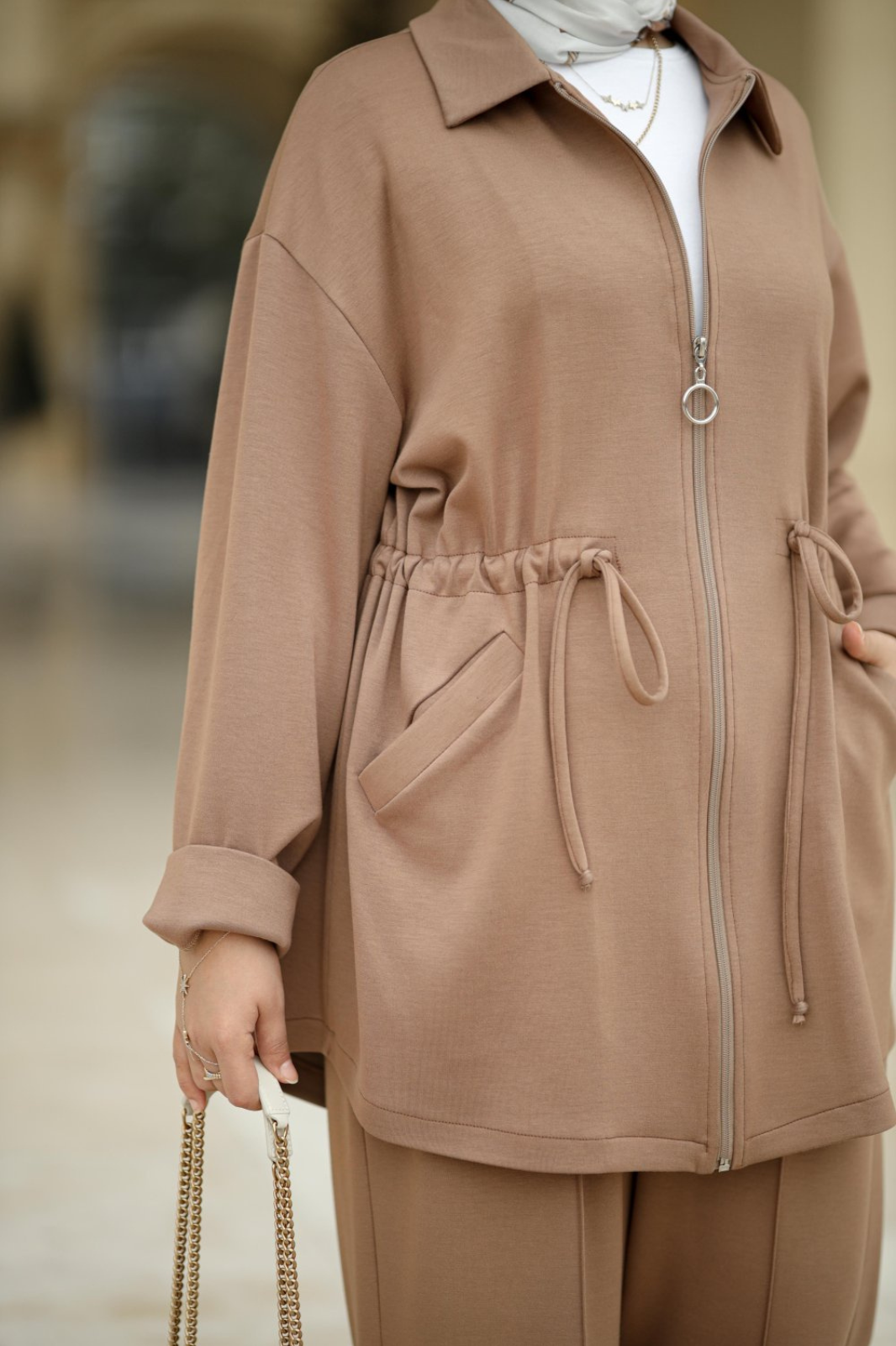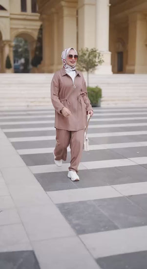 This two-piece modest set brings that clean, effortless look everyone keeps trying to copy. The top features a front zipper and an adjustable drawstring waist for a flattering, easy fit, plus practical side pockets. Wide-leg pants give relaxed movement and all-day comfort. Made from a soft, smooth fabric that drapes beautifully, it's the ideal outfit for daily outings, travel, or a polished casual style without the effort.