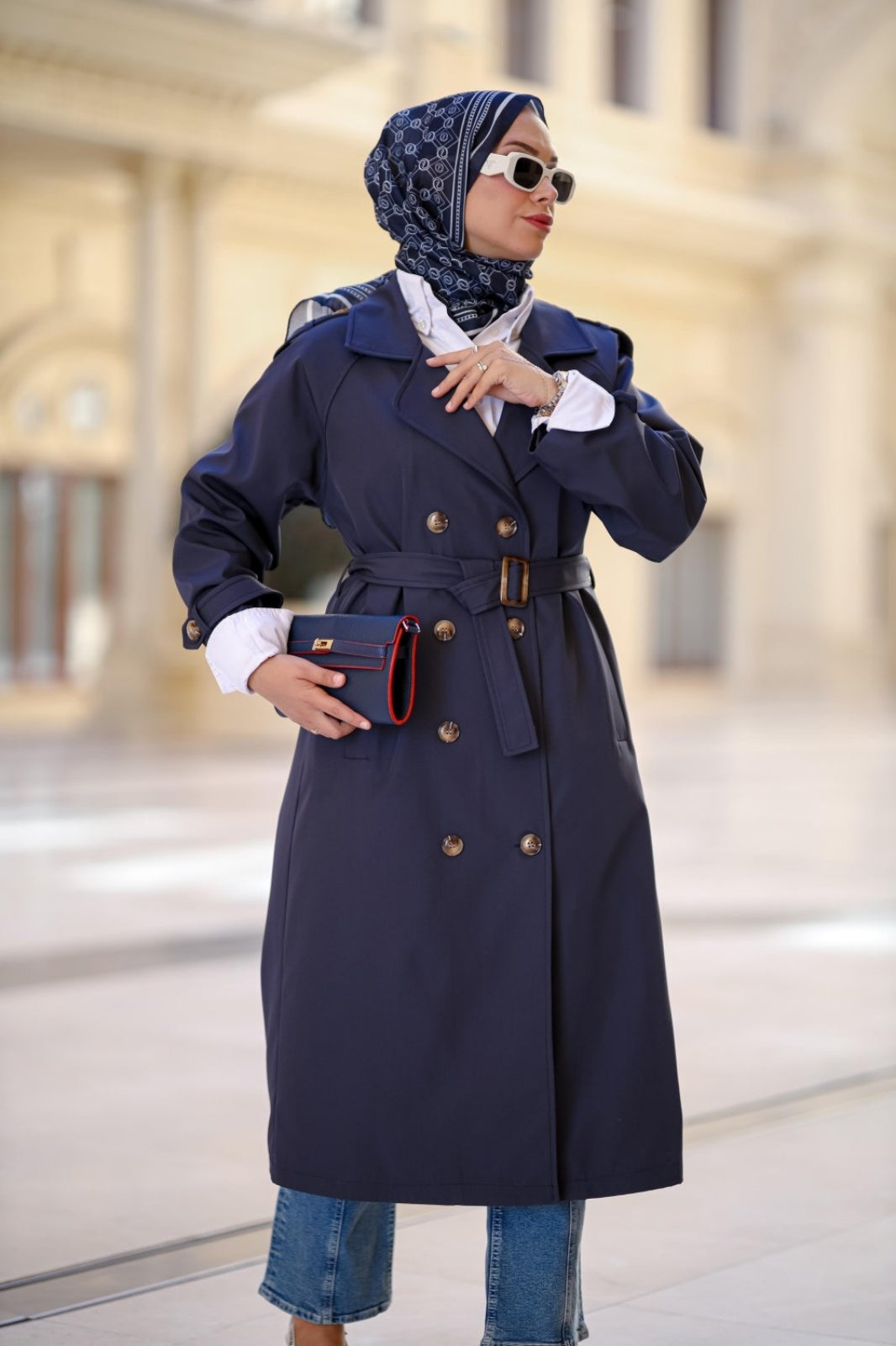 A timeless belted trench coat designed for a modest yet modern look. It features a clean front, wide lapels, and a waist belt for a flattering fit. The smooth fabric and elegant button details make it perfect for both casual days and refined outings.